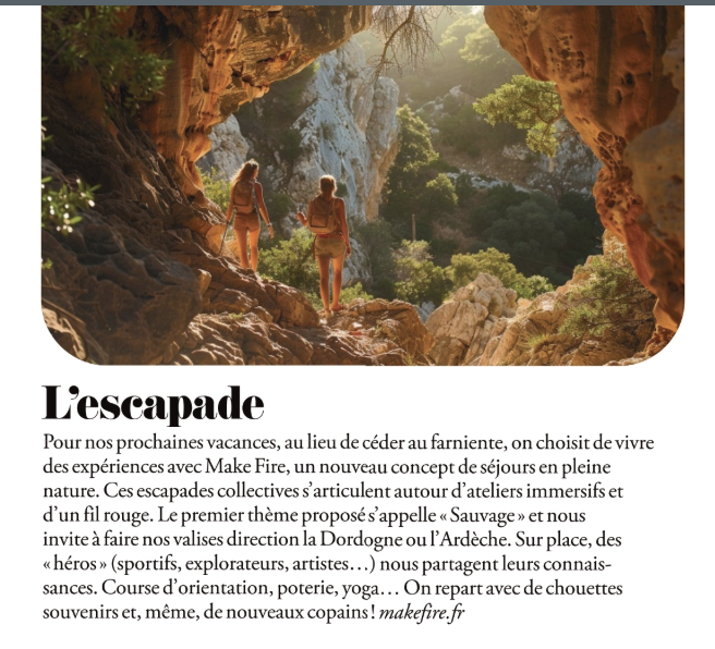 Make Fire choisit des lieux uniques et collabore avec leurs équipes pour créer des séjours tout inclus. Les hôteliers garantissent confort et services, Make Fire apporte thèmes, ateliers et moments collectifs, toujours dans le respect de la nature.